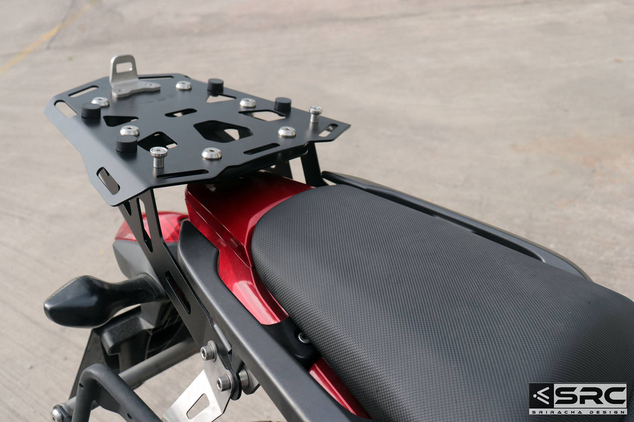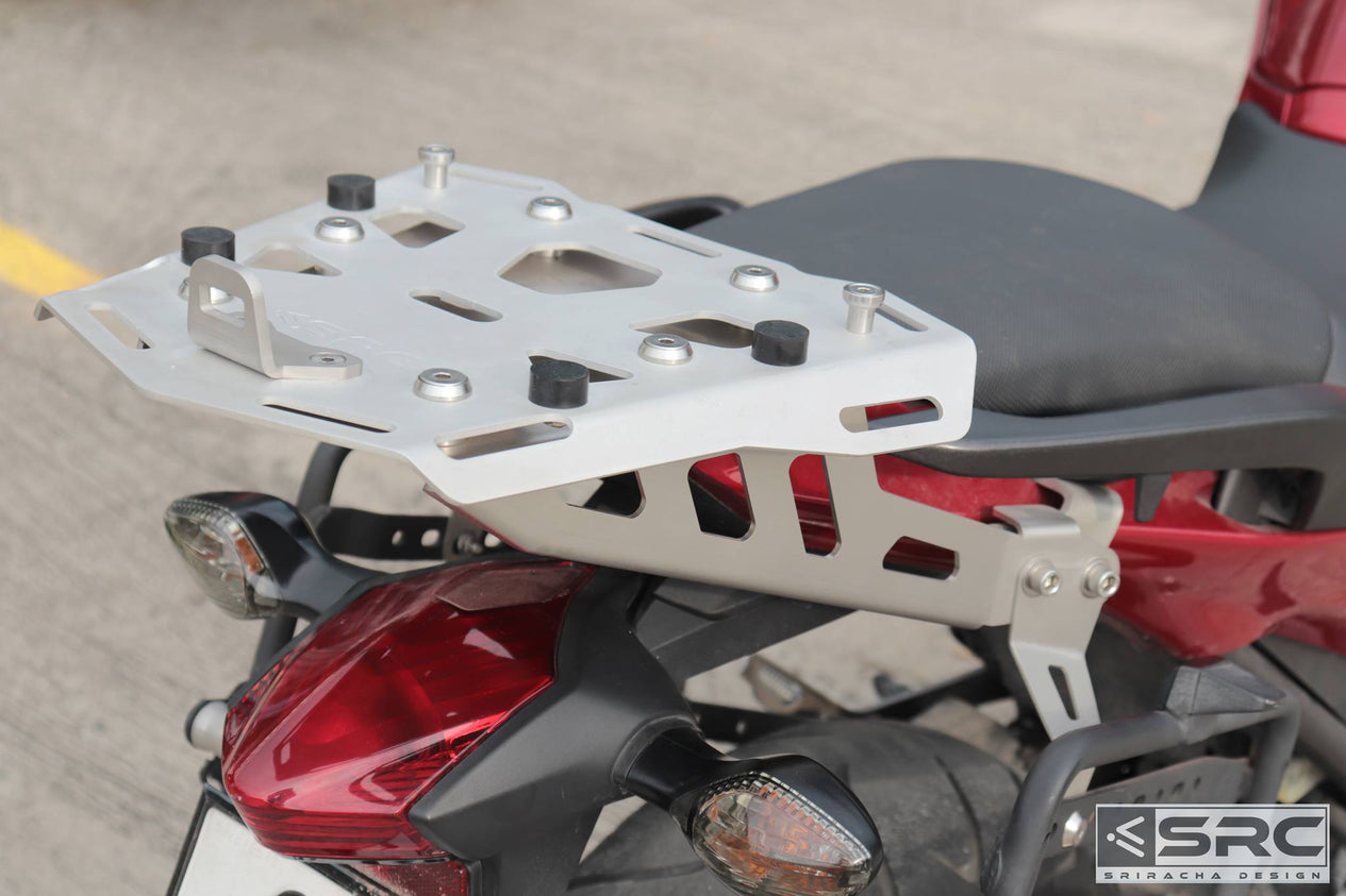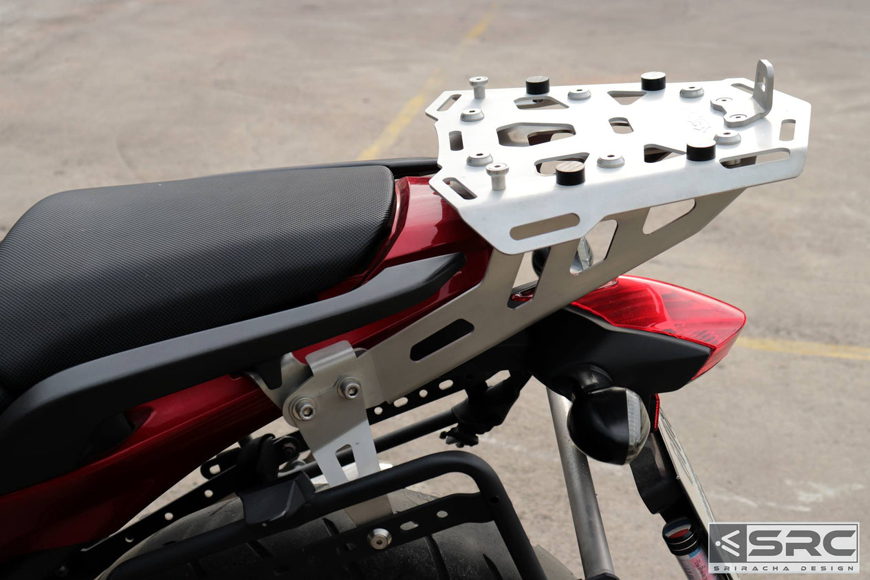 Trick lightweight aluminum tail rack in silver brushed aluminum or satin black powder coat with top quality stainless hardware for your NC750!