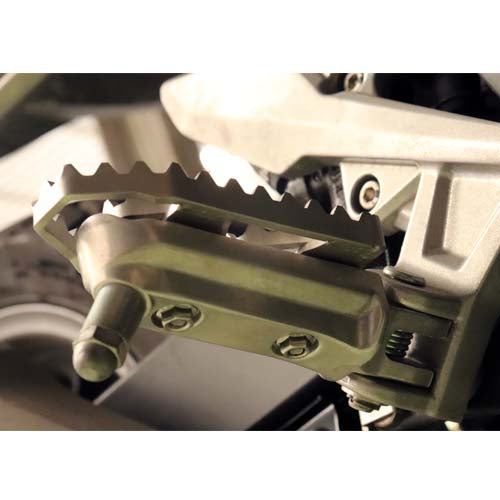 This side stand extension offers a large contact surface (50% larger than stock) to improve the motorcycle’s parking footprint on rough surfaces and soft ground.