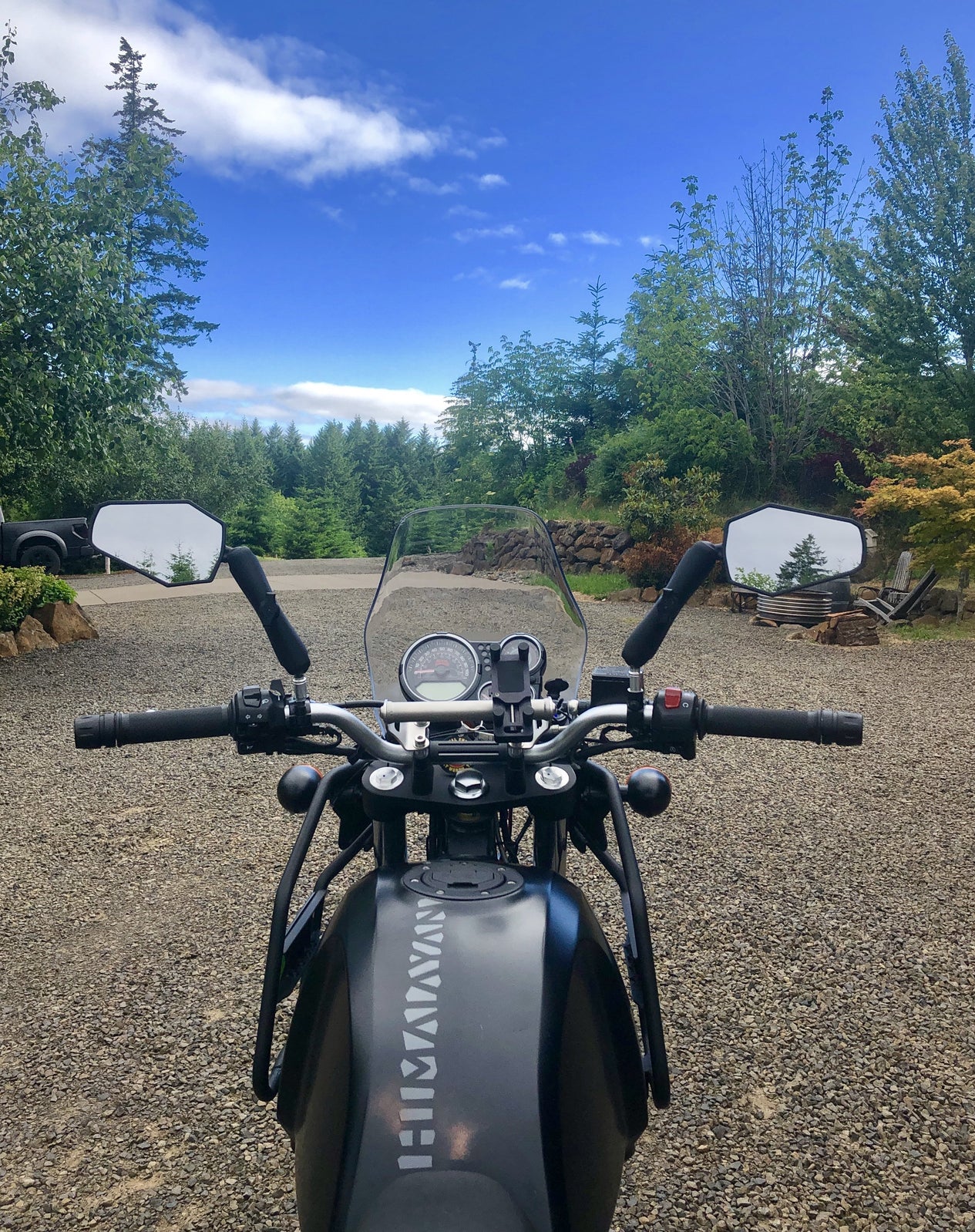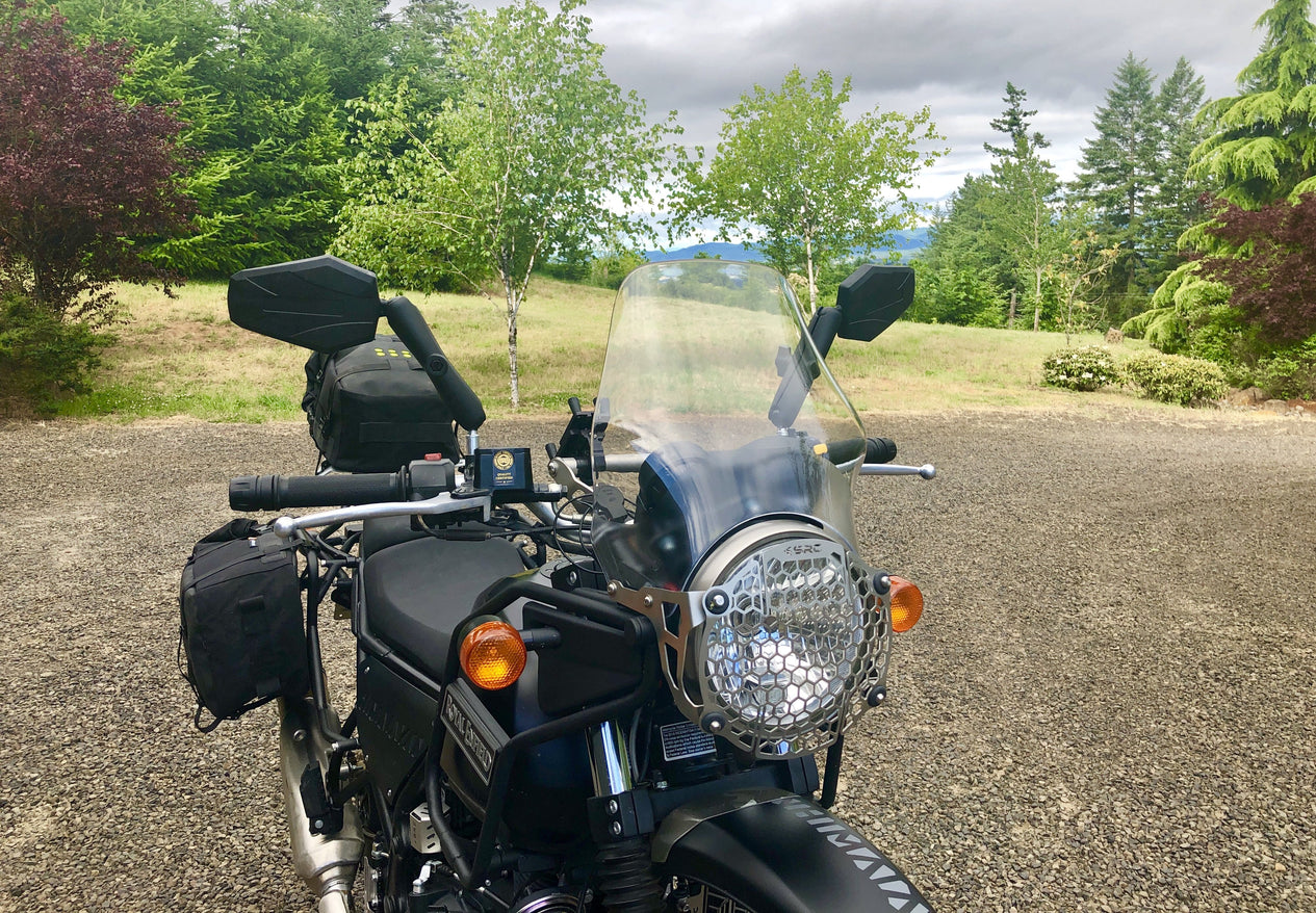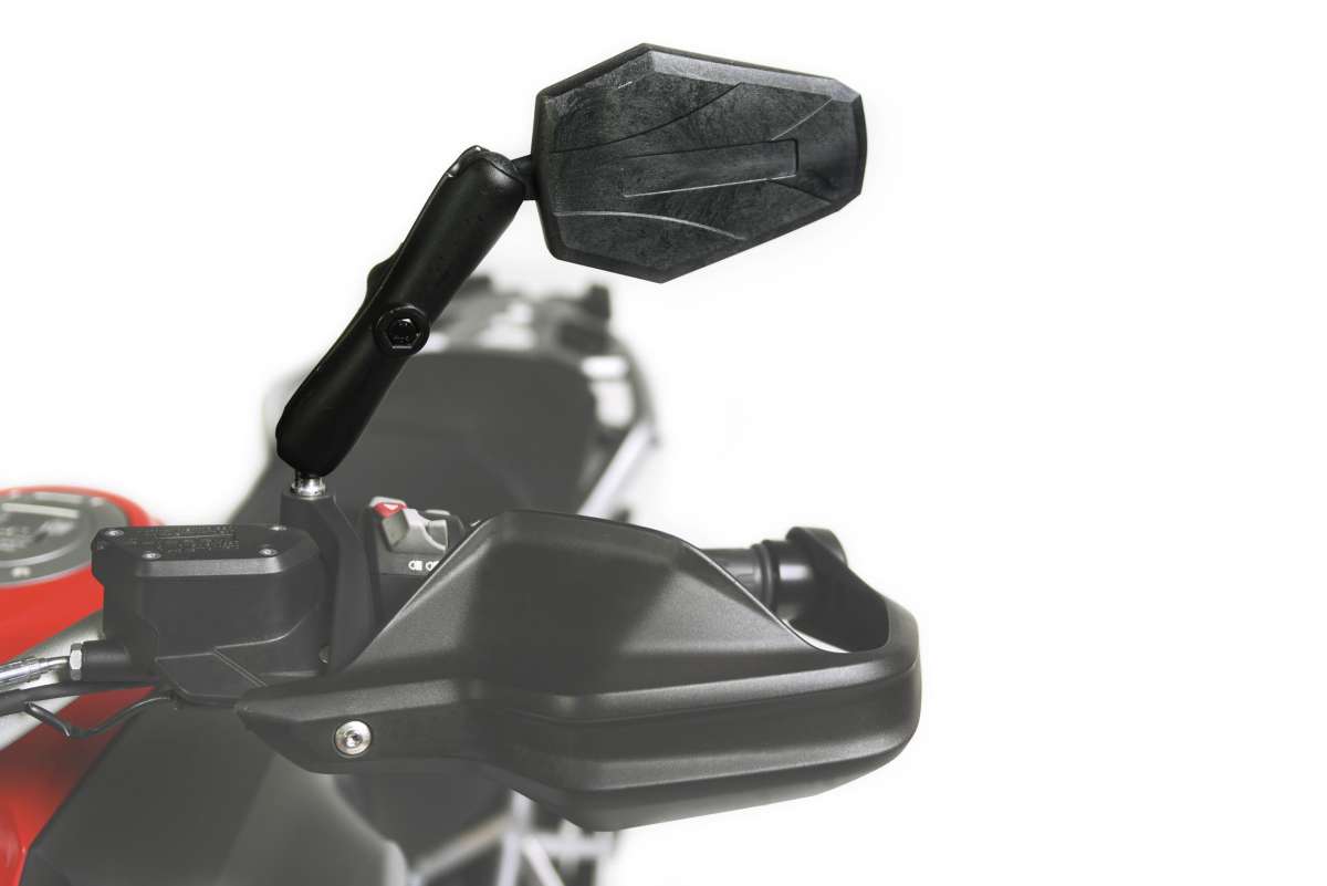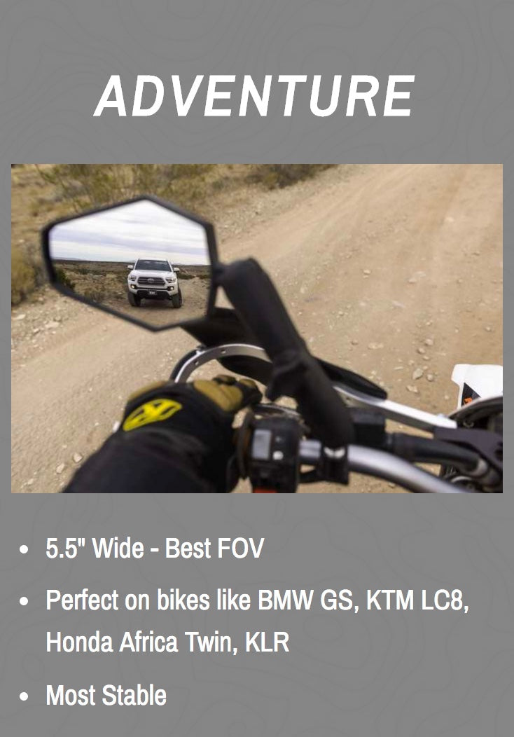 Over the years we have tried many popular Adventure bike mirror options and always come back to the simple and durable DoubleTake ADV sets as they simply work and provide an excellent field of view with minimal vibration distortion. We feel this is the most important feature, functionality over form. There are a bunch of small/minimalist options to choose from on the web if you're into that, but safety and visibility are most important to us and that's why we run the DOUBLETAKE ADVENTURE mirrors on all of our bikes.