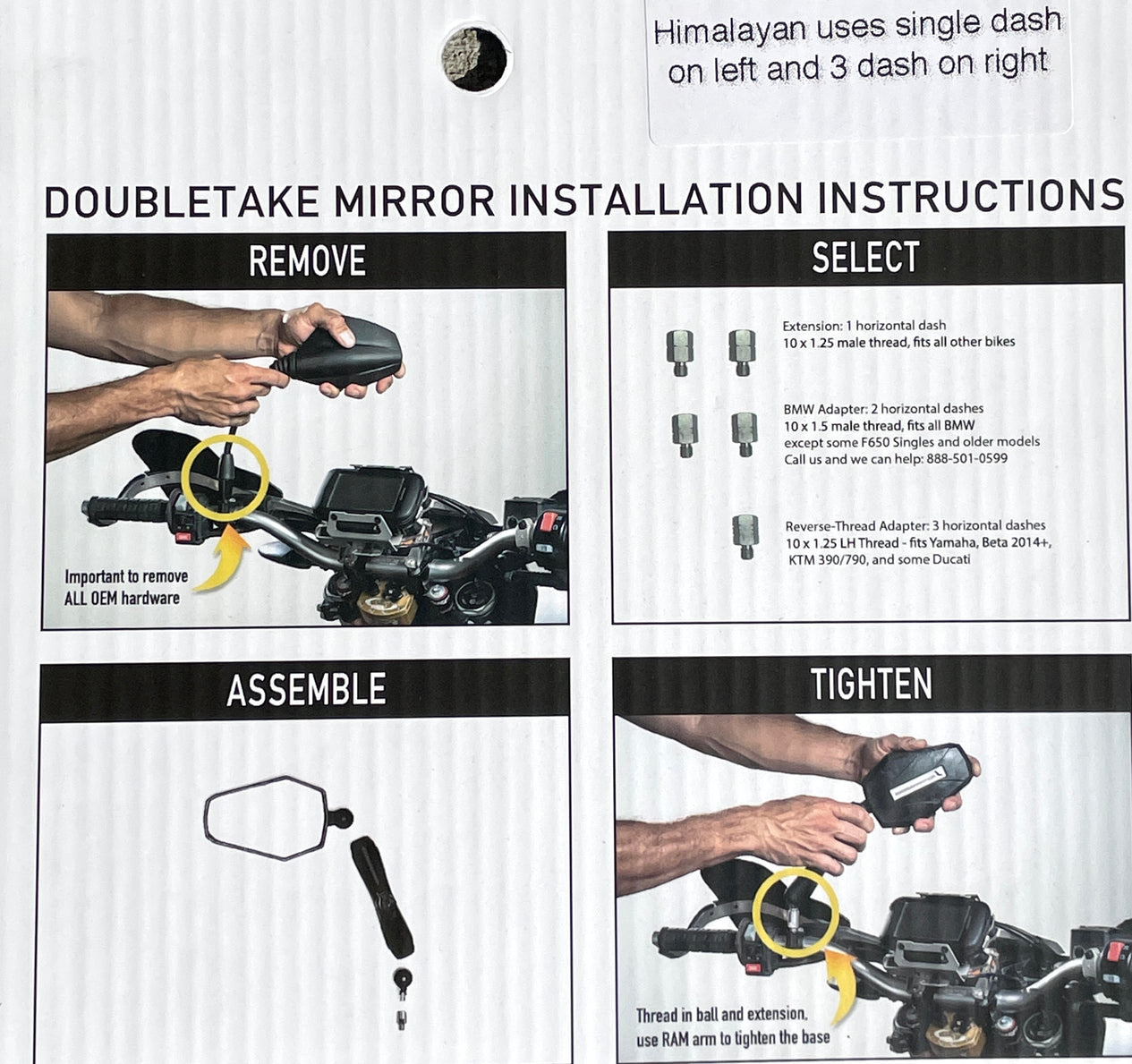 Install Tip: We recommend using one of the extension arms tightly clamped onto the ball mount to tighten the ball mount (and adapters if needed) into the mirror mounts of your bike.