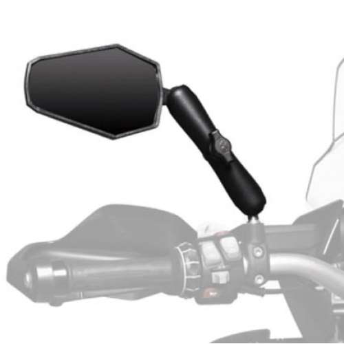This mirror is the product of much frustration- I spent years breaking other designs and wondering what was going on behind me on the road. Eventually, when I dropped my bike and found myself buying two(!) new master cylinders as a result, I decided it was time to make a really good mirror, one that would function well as a mirror, and also protect the bike (and me) from damage. I had three goals for my design: That it work as well as an OEM mirror for seeing what was going on behind. That it would be indestructible. It would have to give way in a crash to avoid damage not only to the mirror, but also to the bike. That it could fold completely out of the way, so that when I am offroad, I don't have to think about it. Many experiments later, the mirrors for sale here is the result. Both models hit all three marks right on the nose. We use SAE spec glass to give maximum visibility (it can be important to distinguish Crown Victoria headlights from other vehicles!), it is made right here in Colorado Springs from a super tough nylon that we are so certain will survive we offer a lifetime warranty (on the housing, not the glass, but you can buy the glass separately), and sure enough, it folds right down when you want it gone. If you're deciding between the Adventure model, and the Enduro, our advice is simple. If you plan to fold the mirror down a large percentage of the time, the Enduro is right for you. The long size means the head of the mirror tucks away right behind the headlight. If the mirror will more or less remain extended, get the Adventure- the more compact design is more stable at highway speeds. Either way, you can't go wrong.